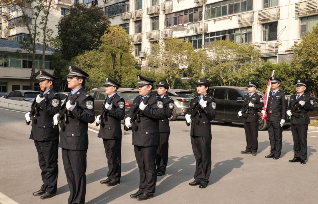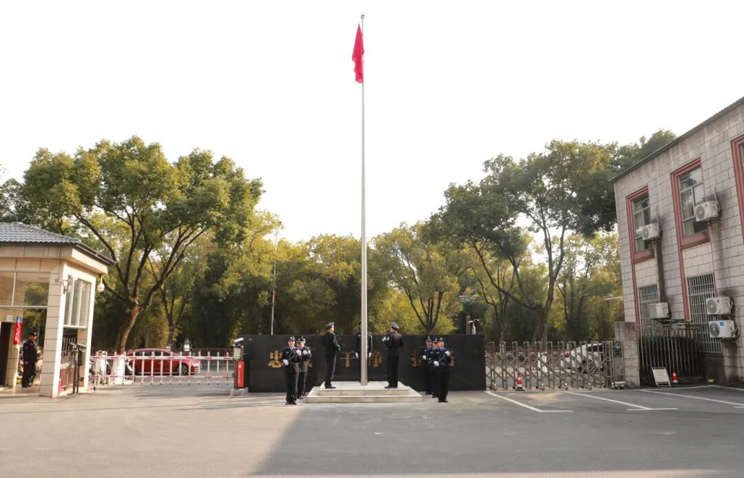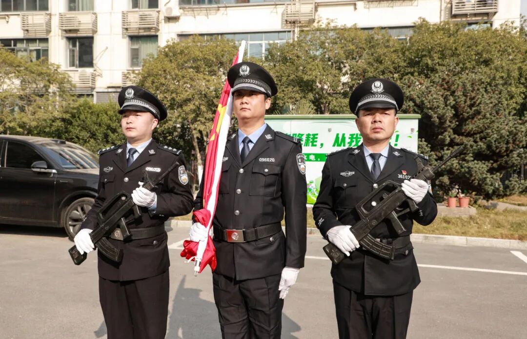 “迎国旗!”随着主持人的庄严指令,司法警察护旗方队迈着铿锵步伐护送国旗至旗杆下。《义勇军进行曲》激昂奏响,五星红旗冉冉升起,全体干警肃立行注目礼,歌声中饱含对祖国的赤诚与对法治的信仰。