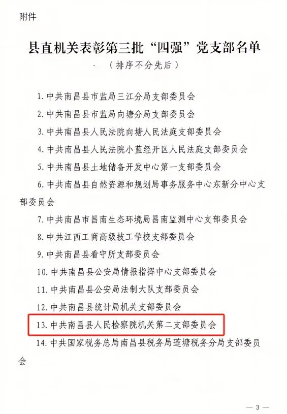 近日,中共南昌县直属机关工作委员会印发《关于县直机关第三批“四强”党支部评选结果的通报》。在这次评选中,中共南昌县人民检察院机关第二支部委员会获评“县直机关第三批‘四强’党支部”。