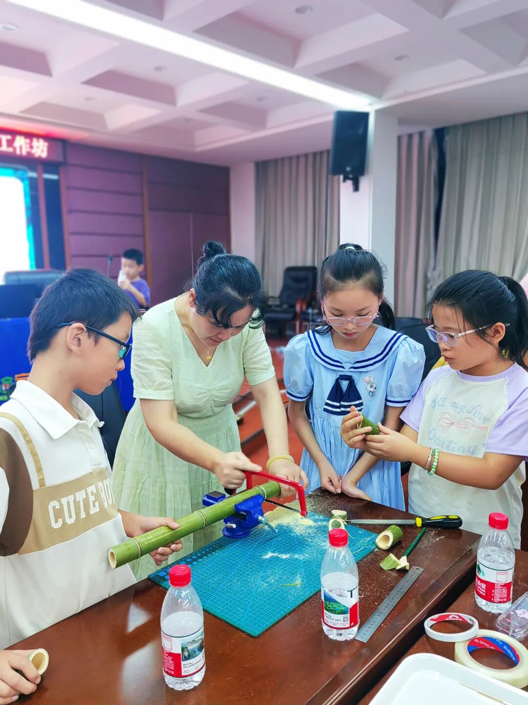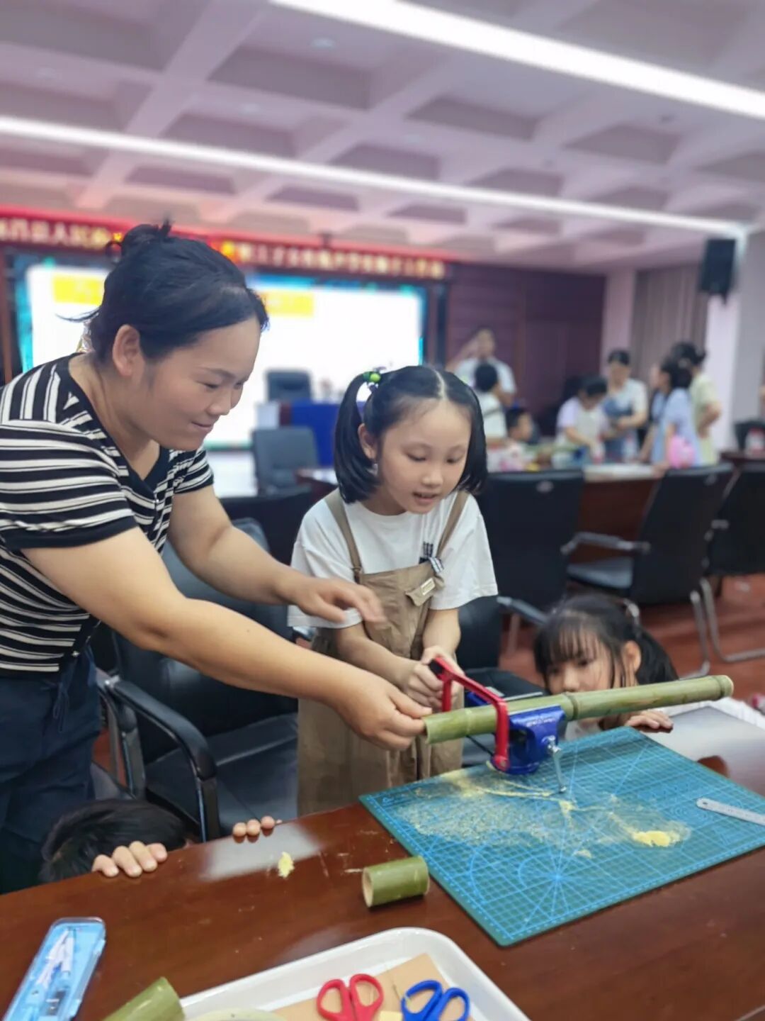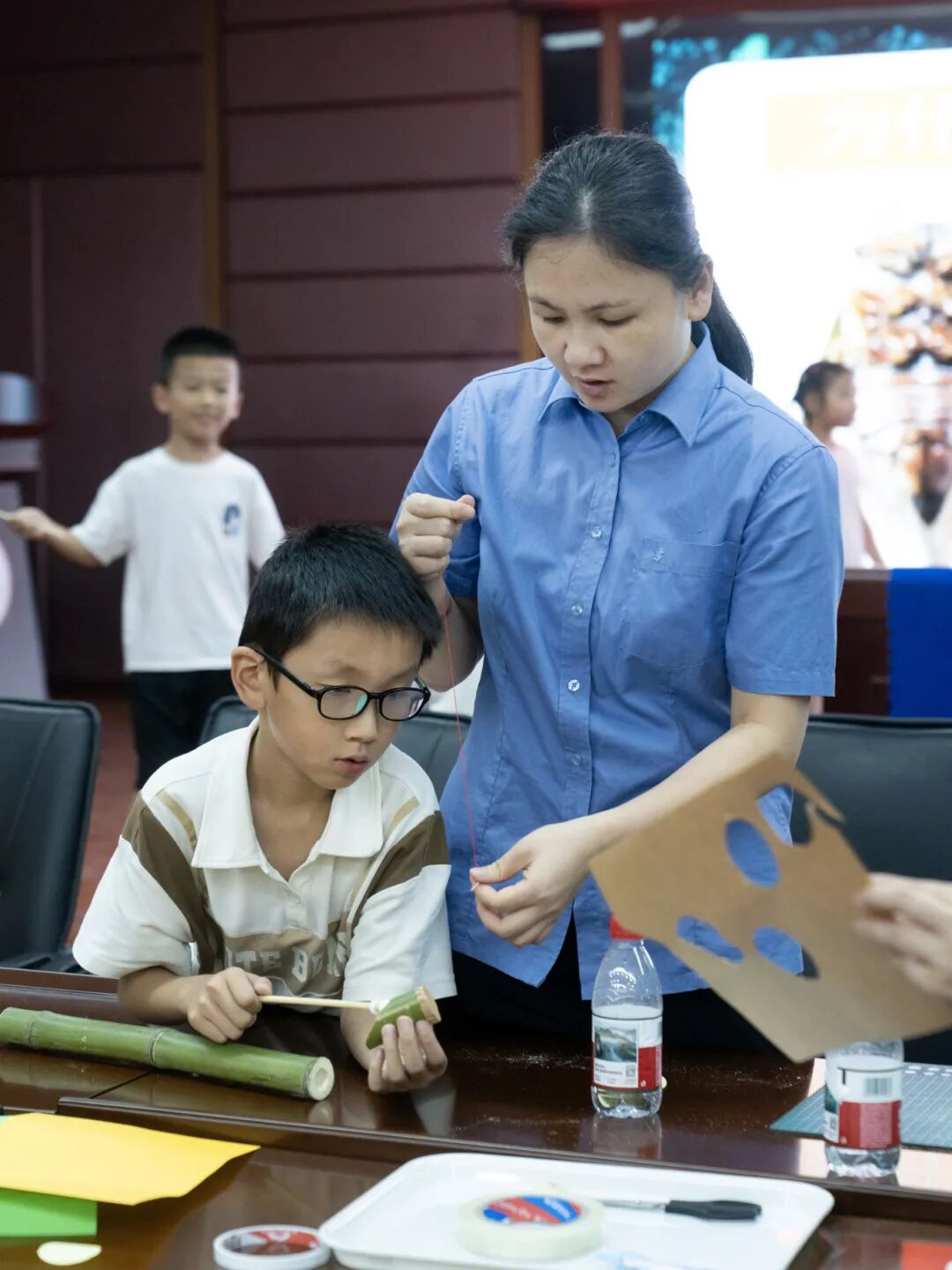 专业教师全程悉心守护。在竹片打磨、热蜡操作等环节,老师们耐心指导,确保每个孩子都能在安全的环境中尽情探索。孩子们在“发现问题-尝试解决-验证效果”的循环中,如同茁壮成长的小树苗,逐步掌握了工具操作、数据记录和简单故障排查等实践技能。当竹蝉“沉默”时,孩子们没有丝毫气馁,而是自发地尝试重新绑紧棉线、细心打磨竹片毛刺。那专注的神情、执着的模样,已然展现出初步的工程思维和令人赞叹的问题解决能力。