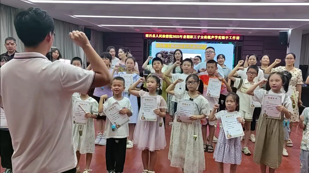 作品完成的瞬间,自豪与喜悦溢满孩子们的脸庞。他们不仅收获了《南昌县人民检察院职工子女实验工坊“竹蝉探秘·声动夏夜”传统声学手工制作优秀小匠人》纪念证书,更在指导老师的带领下,庄严宣誓:“我承诺:用科学发现真相,以规则守护公正!”稚嫩却坚定的声音,饱含着对未来的美好期许,在会议室里久久回荡。