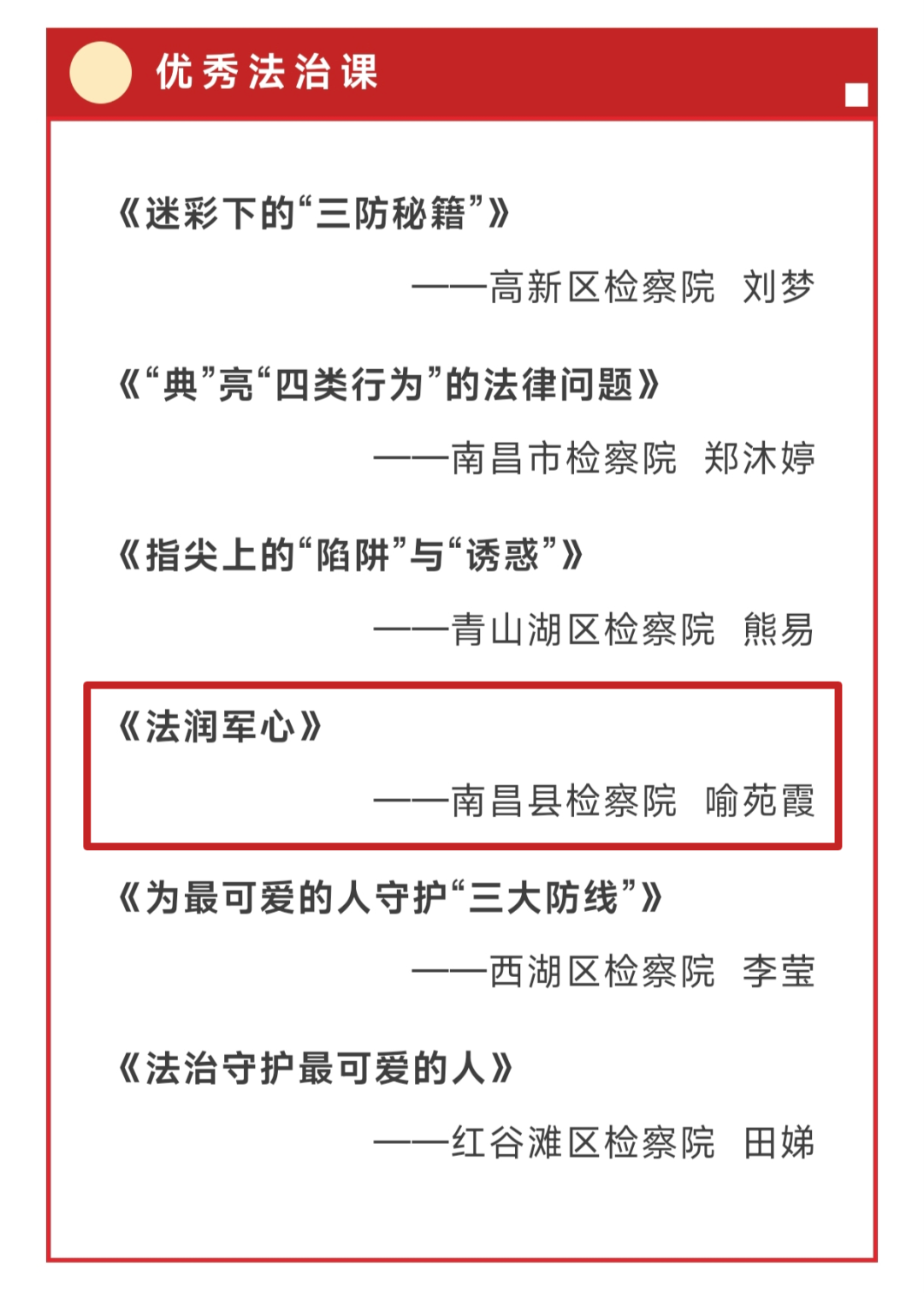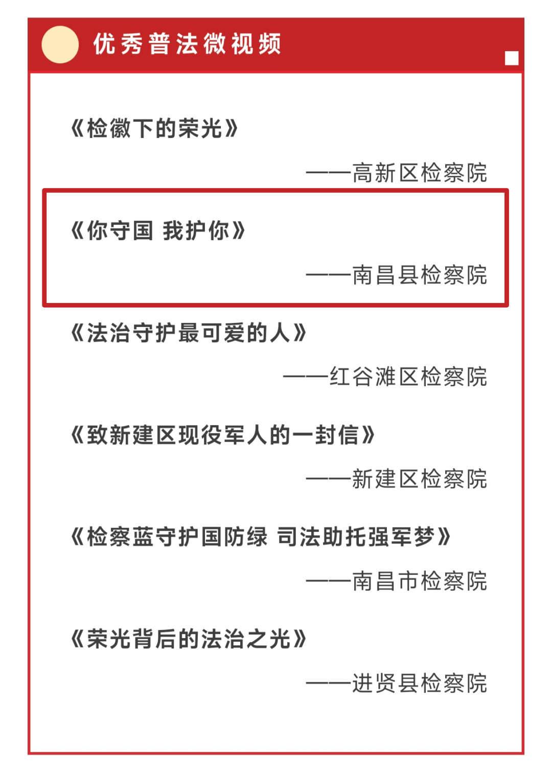 近期,南昌市检察机关集中开展了“送法进军营”法治课宣讲和微视频展播活动。南昌县人民检察院2件作品获奖,其中,我院驻向塘开发区检察室主任喻苑霞讲授的《法润军心》法治课入选“优秀法治课”;我院创作的《你守国 我护你》微视频入选“优秀普法微视频”。