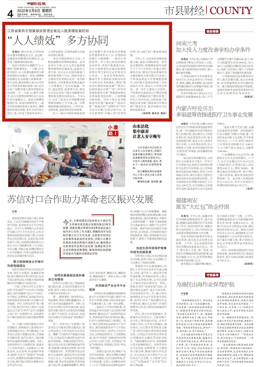 9月8日,《中国财经报》以“人人绩效 多方协同——江西省南昌市预算绩效管理全面迈入提质增效新阶段”为题,深入报道“我市推动预算绩效管理工作提质增效”的有关情况,以下是报道全文:
