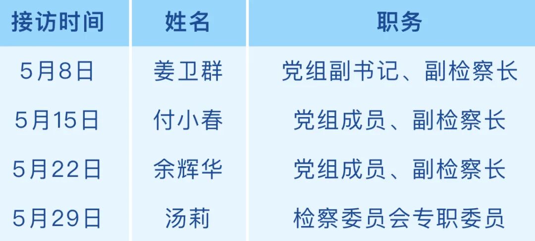 为深入贯彻习近平法治思想,践行新时代检察机关以人民为中心的发展思想,进一步密切检察机关同人民群众的联系,提升12309检察服务中心服务质效,扎实做好检察长接访工作,推动案结事了人和,南昌县人民检察院坚持开展12309检察服务中心“检察长接访日”活动,现将本院2024年5月“检察长接访日”接访安排公告如下: