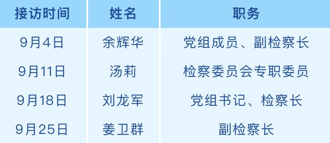 为深入贯彻习近平法治思想,践行新时代检察机关以人民为中心的发展思想,进一步密切检察机关同人民群众的联系,提升12309检察服务中心服务质效,扎实做好检察长接访工作,推动案结事了人和,南昌县人民检察院坚持开展12309检察服务中心“检察长接访日”活动,现将本院2024年9月“检察长接访日”接访安排公告如下: